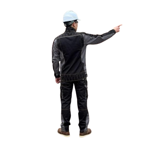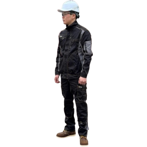 Черный рабочий костюм с контрастной строчкой, усиленными вставками на локтях, плечах и коленях. Имеет нагрудные, боковые и нарукавные карманы, а также вместительные карманы на бедрах и коленях для инструментов. Оснащен молниями и липучками для удобства и защиты.