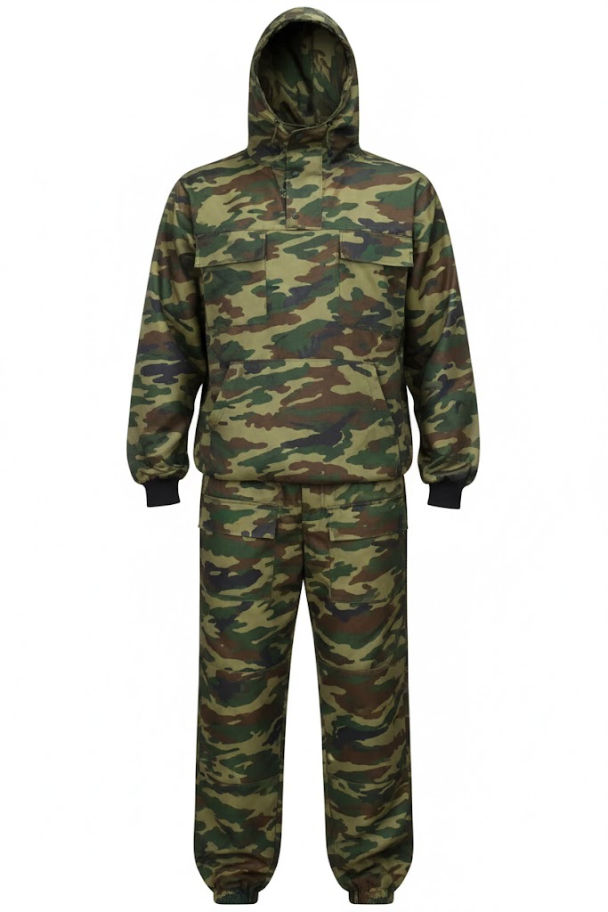 Костюм состоит из куртки и брюк. Куртка с регулируемым капюшоном, со съемной вставкой из противомоскитной сетки на молнии, с накладными карманами с клапаном на кнопках, складки-ловушки на груди и рукавах, рукава с трикотажными напульсниками, низ куртки на эластичной резинке с фиксатором. Брюки прямые с эластичной лентой в притачном поясе со шлевками, боковые косые карманы, складки-ловушки над наколенниками, с эластичным шнуром на фиксаторе по низу брюк.