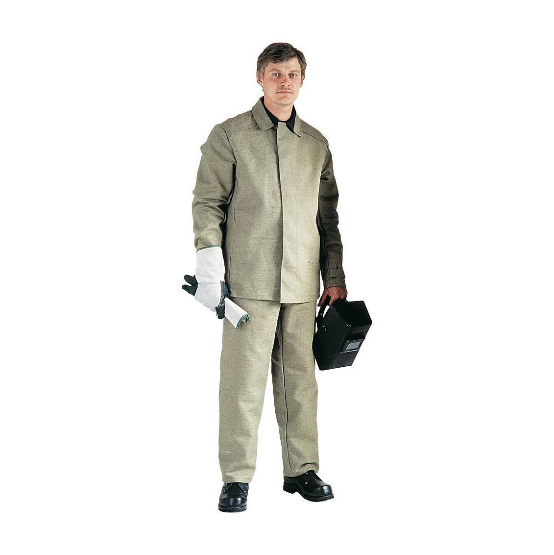 Костюм для проведения сварочных работ, состоит из куртки и брюк. Куртка с центральной потайной бортовой застежкой на пуговицы и карманами в боковых швах. На спинке кокетки и под проймами рукавов, вентиляционные отверстия. Воротник отделан хлопчатобумажной тканью для более комфортного ношения. Брюки с откидывающейся передней частью, задние половинки с притачным поясом, застегивающимся спереди, с карманами в боковых застежках брюк.