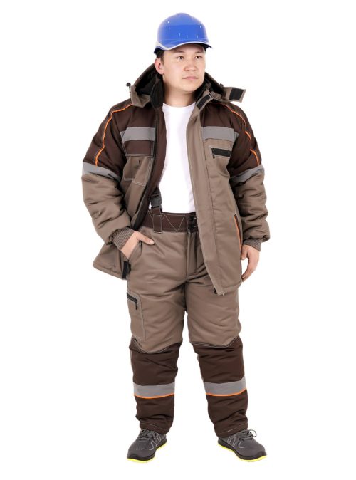 БРЮКИ прямые, с бретелями, с притачной утеплённой подкладкой, с центральной застежкой гульфика на тесьму «молния», широким фигурным поясом, с застежкой на поясе на две пуговицы, с тремя узкими шлёвками на задних половинках и двумя шлёвками-держателями фастексов на передних половинках. Внутренние боковые карманы с наклонным входом, с накладным карманом на правом боковом шве, застегивающимся на тесьму «молния». Наколенники на передних половинках, накладные задние карманы. СОП 50мм для обеспечения видимости.